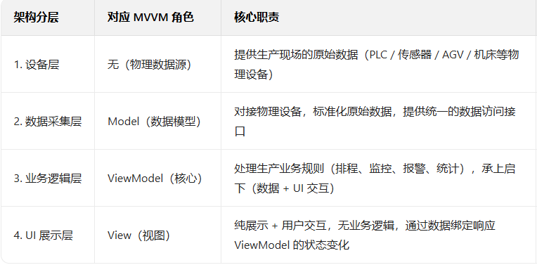 - 核心职责 :✅ 订阅采集层的数据更新事件,处理业务规则(如温度 > 35℃触发报警、产量统计);✅ 封装 UI 交互命令(如启动 / 停止采集、下发生产计划、导出报表);✅ 数据持久化(将实时数据写入数据库,供历史查询 / 报表分析);✅ 状态通知(通过