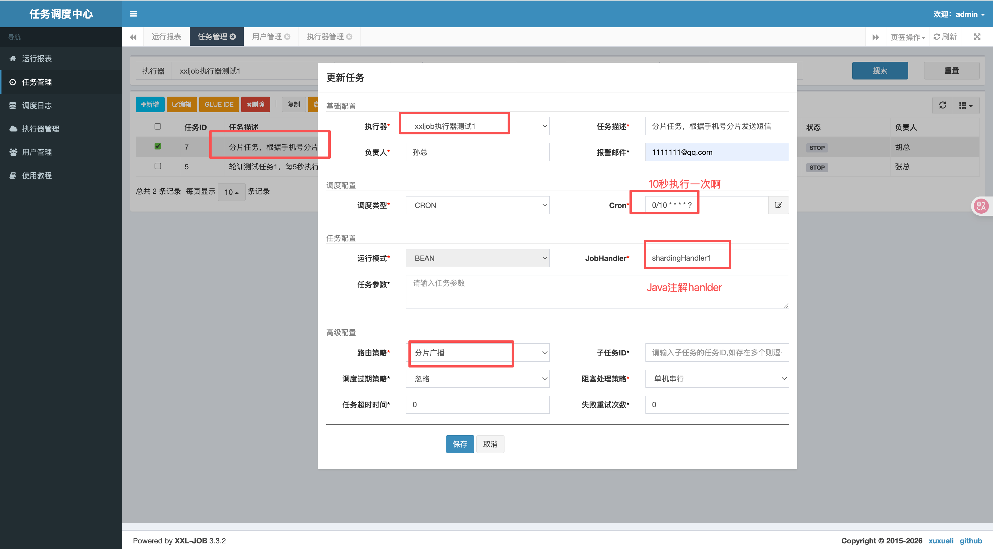 在调度中心配置定时任务