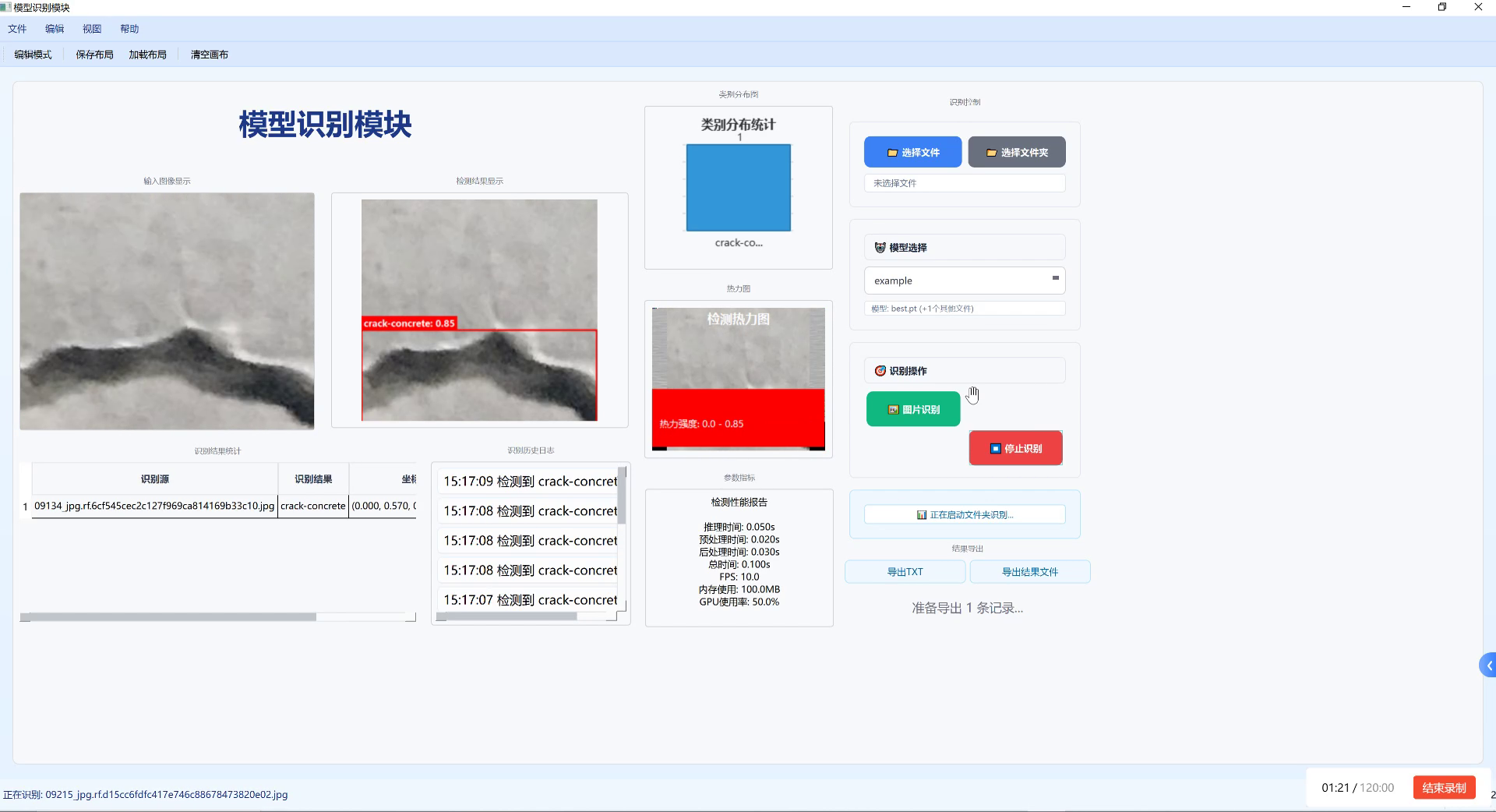 图像识别软件界面,展示了裂缝检测场景的识别结果,其技术架构可直接迁移至海洋鱼类识别任务