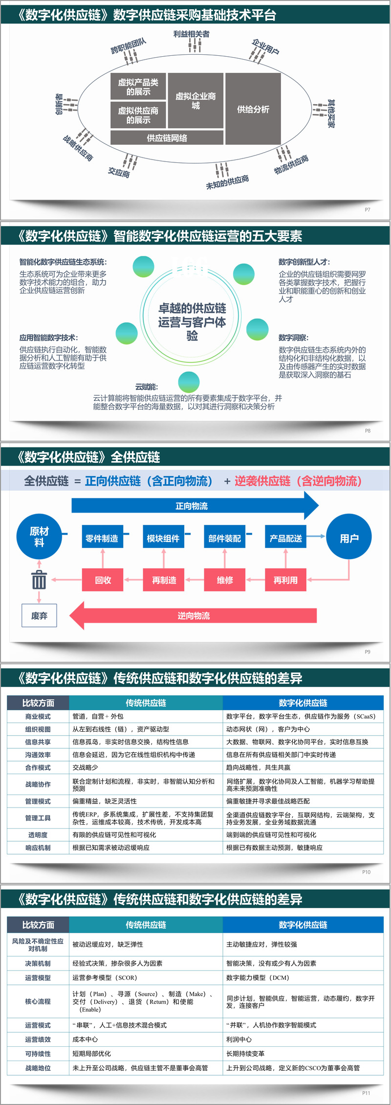 架构设计上,数字化供应链以参考架构为核心,包含数字化商业模式、五大核心要素、技术支撑、新基建与两大核心策略。协同策略强调纵向与横向的全方位协同,通过物联网、数字化平台实现实时信息共享与智能协作;细分策略则替代传统 "一刀切" 模式,依据敏捷性、成本、服务三维度制定差异化方案。全供应链理念打破传统边界,融合正向与逆向供应链,实现资源循环利用与可持续发展。