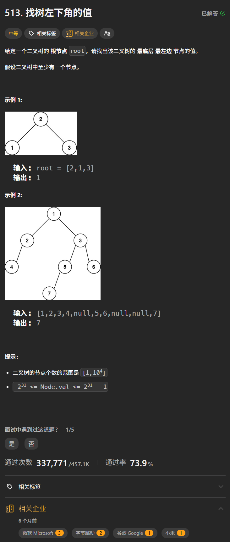 Leetcode---513. 找树左下角的值