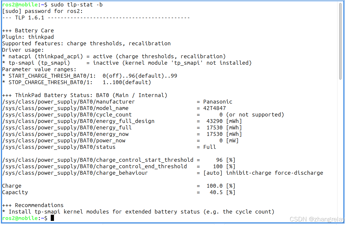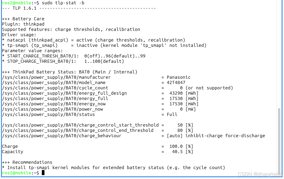 ros2@mobile:~$ sudo tlp setcharge 50 80 BAT0