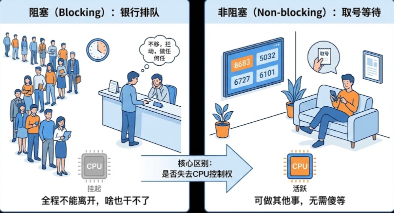三、阻塞 vs 非阻塞:关注"等待状态"