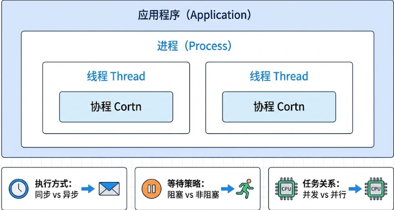 简单总结:应用程序由进程构成,进程包含线程,线程内可调度协程;而同步/异步描述执行顺序,阻塞/非阻塞描述等待状态,并发/并行描述任务关系。