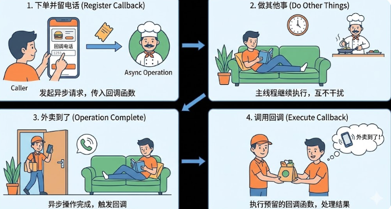 点外卖时留电话:你下单 → 留电话(回调函数)→ 做其他事 → 外卖到了(调用回调)→ 取外卖