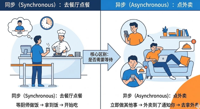 - 同步:去餐厅点餐 → 等厨师做饭 → 拿到饭 → 开始吃(全程等待,啥也干不了)