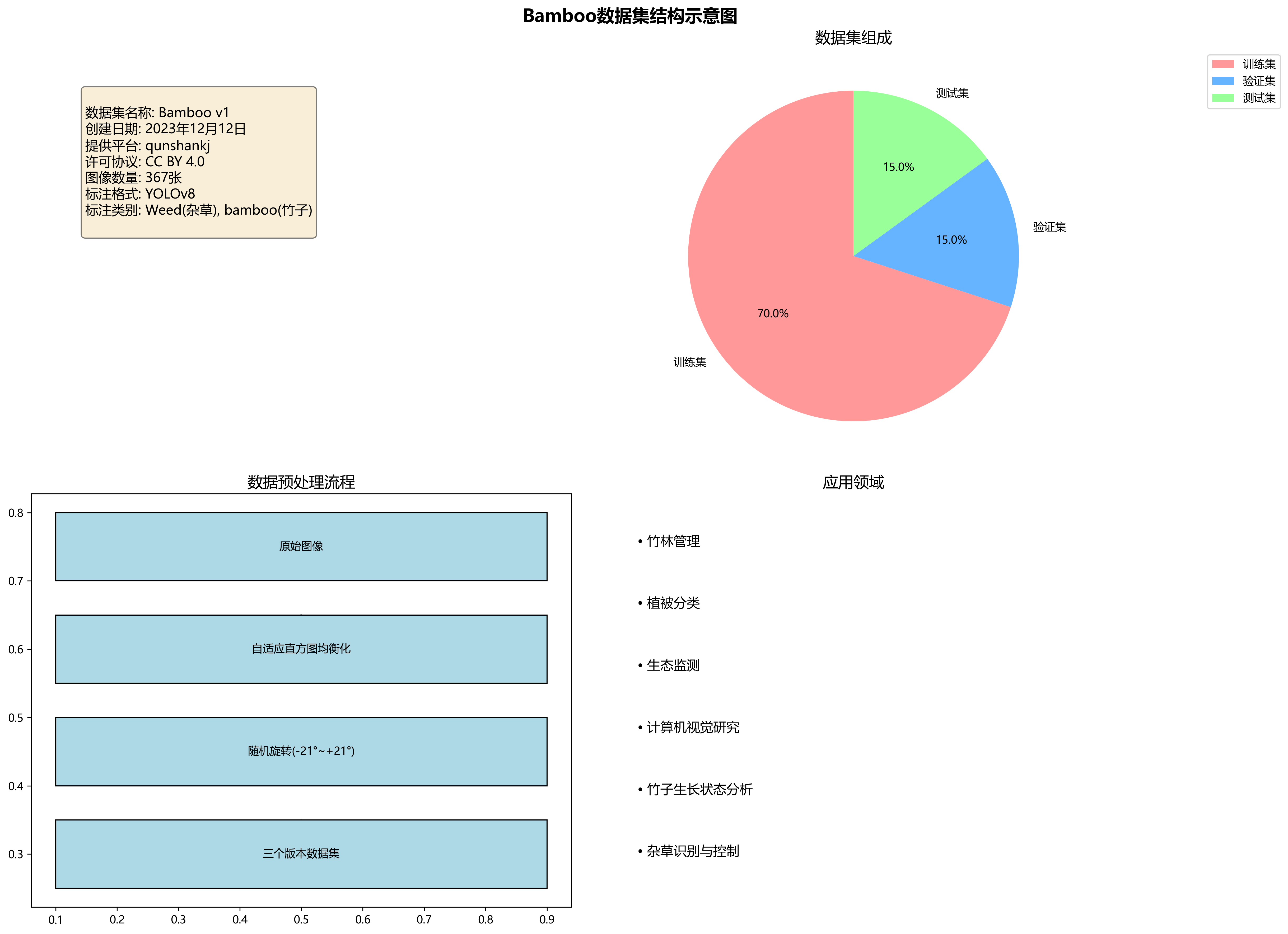 本数据集名为Bamboo,版本为v1,创建于2023年12月12日,由qunshankj平台用户提供,采用CC BY 4.0许可协议。数据集包含367张图像,均采用YOLOv8格式进行标注,标注类别包括'Weed'(杂草)和'bamboo'(竹子)两类。数据集经过预处理,应用了自适应直方图均衡化的自动对比度增强技术,并通过随机旋转(-21度至+21度)的数据增强方法创建了三个版本的源图像,以增加数据多样性。数据集分为训练集、验证集和测试集三部分,适用于目标检测任务,特别是针对竹林环境中的竹子和杂草的识别与定位研究。图像内容主要为竹林特写,展现了竹子的形态特征、生长状态及分布规律,为基于计算机视觉的竹林管理、植被分类及生态监测等应用提供了重要的数据支持。