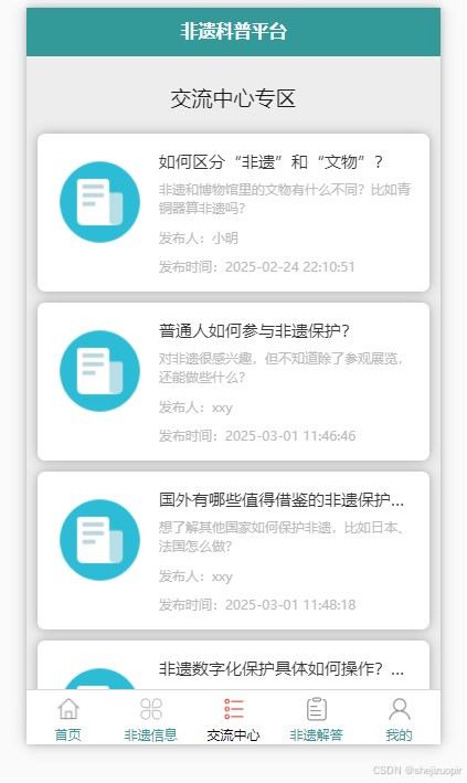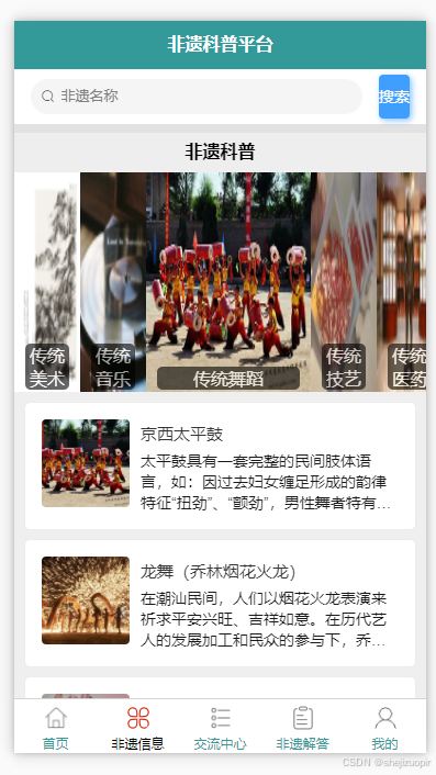 传统中国非物质文化遗产(以下简称"非遗")的传播和传播途径有限,多以口头传统、碎片化方式进行,对其传播范围、影响等方面都有限制。为了促进非遗资源的传播与交流,本论文开发基于Spring Boot的非遗科普平台,实现非遗资源的平台化、规范化和数字化实现非遗广泛传播。非遗科普平台的小程序前端开发以uni-app作为核心框架,后台管理系统的前端运用vue.js框架达成数据的可视化展示。后端借助Spring Boot框架搭建数据处理逻辑,精准高效地对各类数据进行处理。采用前后端分离的架构设计,极大地增强了数据处理的规范性,显著提升了处理效率,使系统的开发与维护更加便捷、高效。为实现数据的有效存储与管理,本系统将MySQL数据库作为核心存储方案,该方案能够充分适配系统的数据读写与管理需求。通过开展全面且规范的系统性功能测试,结果表明该平台各功能模块均达到预期设计指标,验证了系统功能的完整性与可靠性。