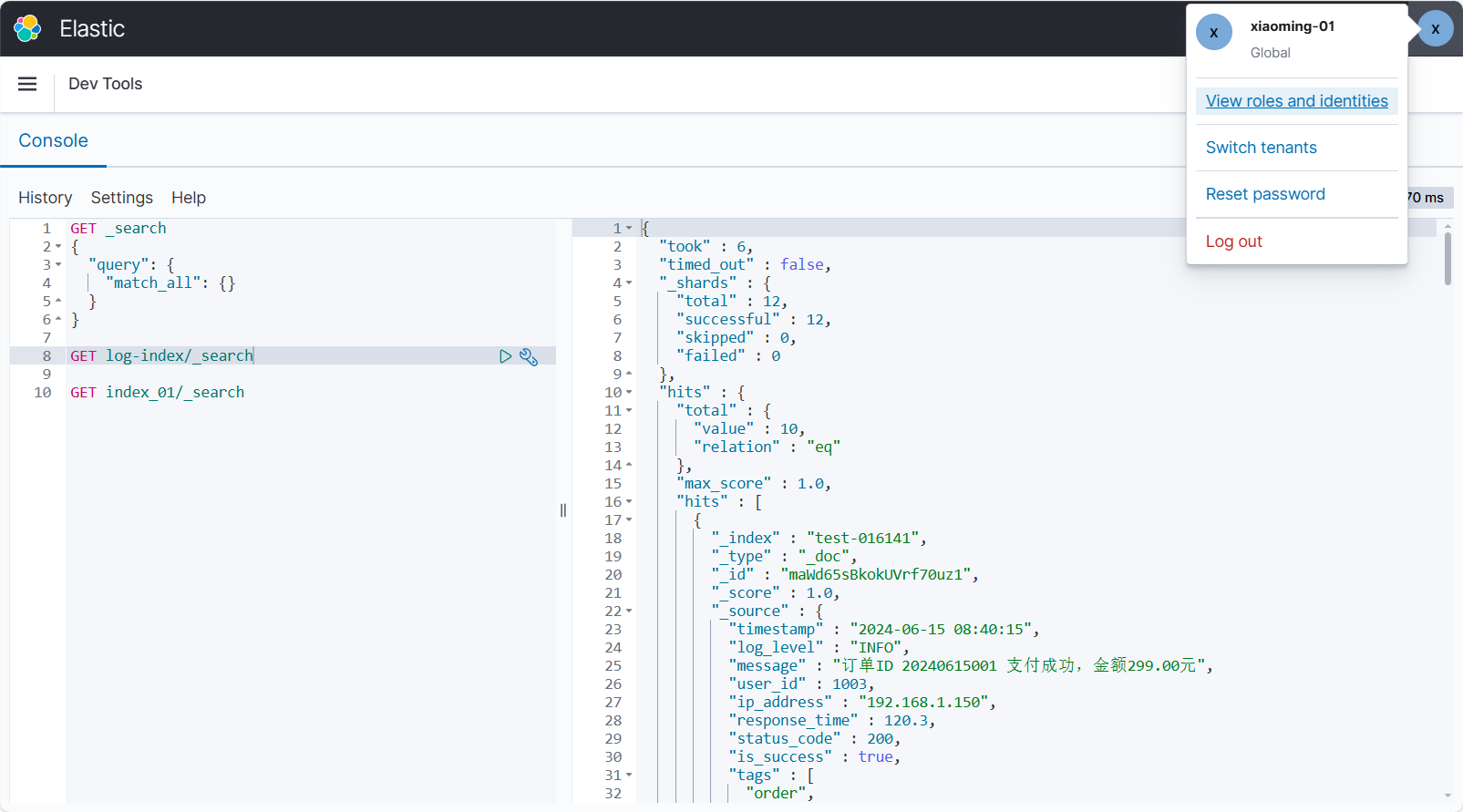 用户 xiaoming-01 会获得 test-02 的权限,可以读 log- 开头的索引。