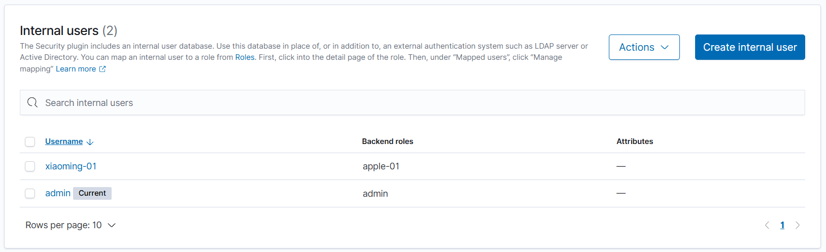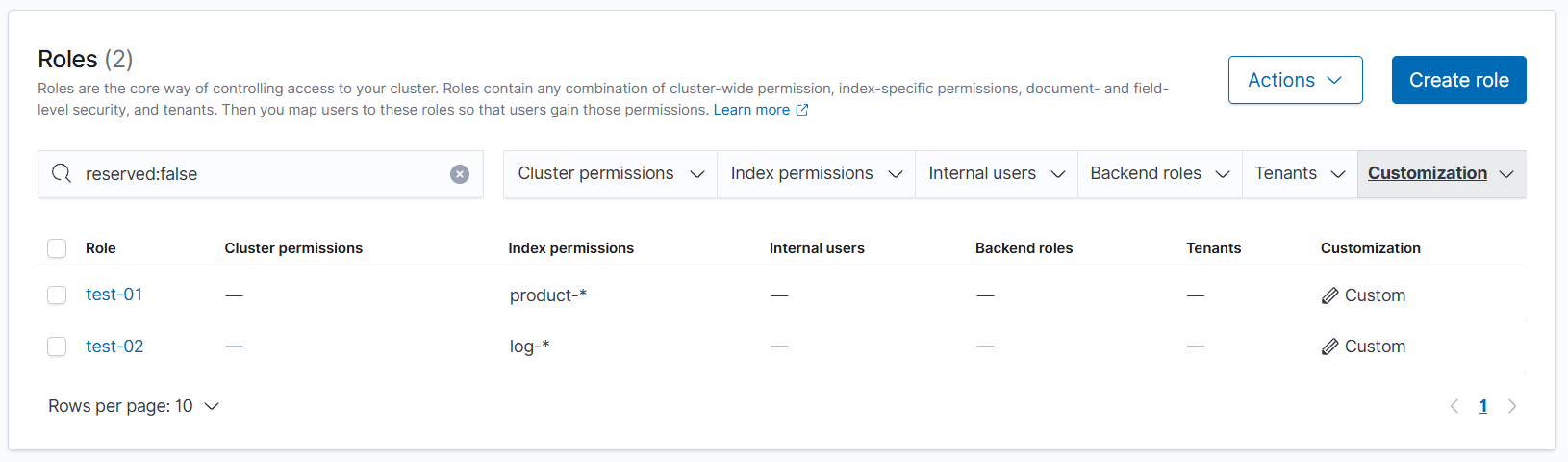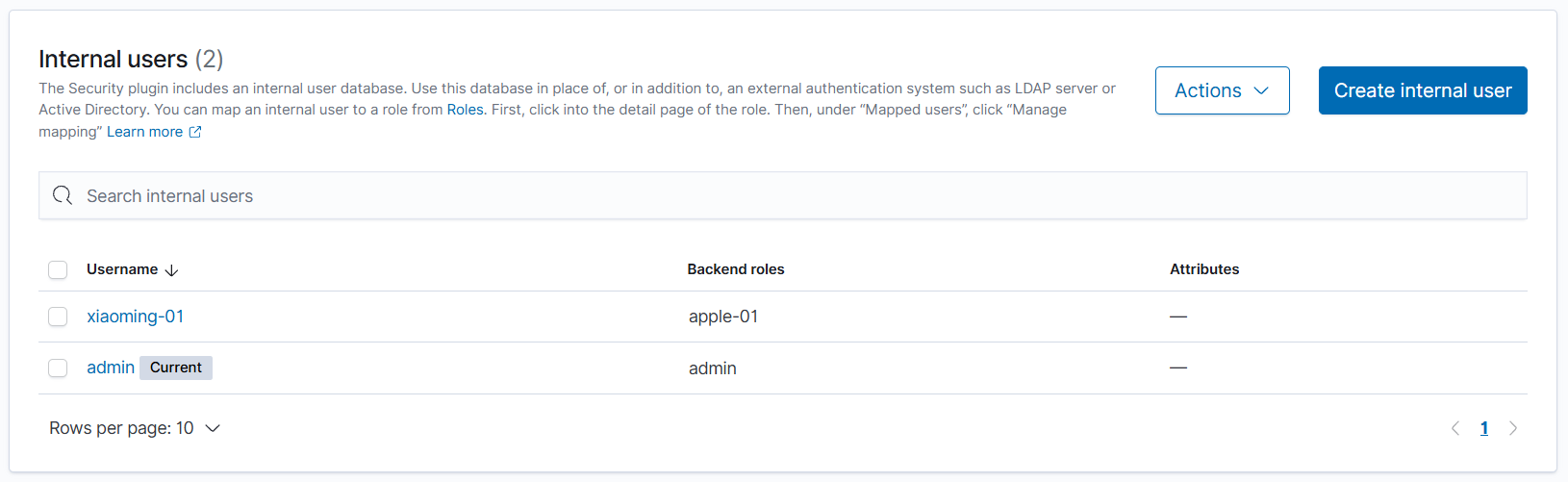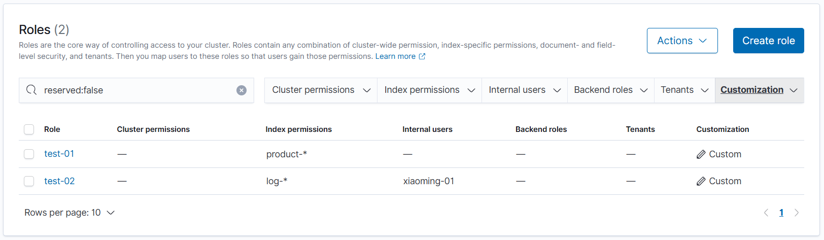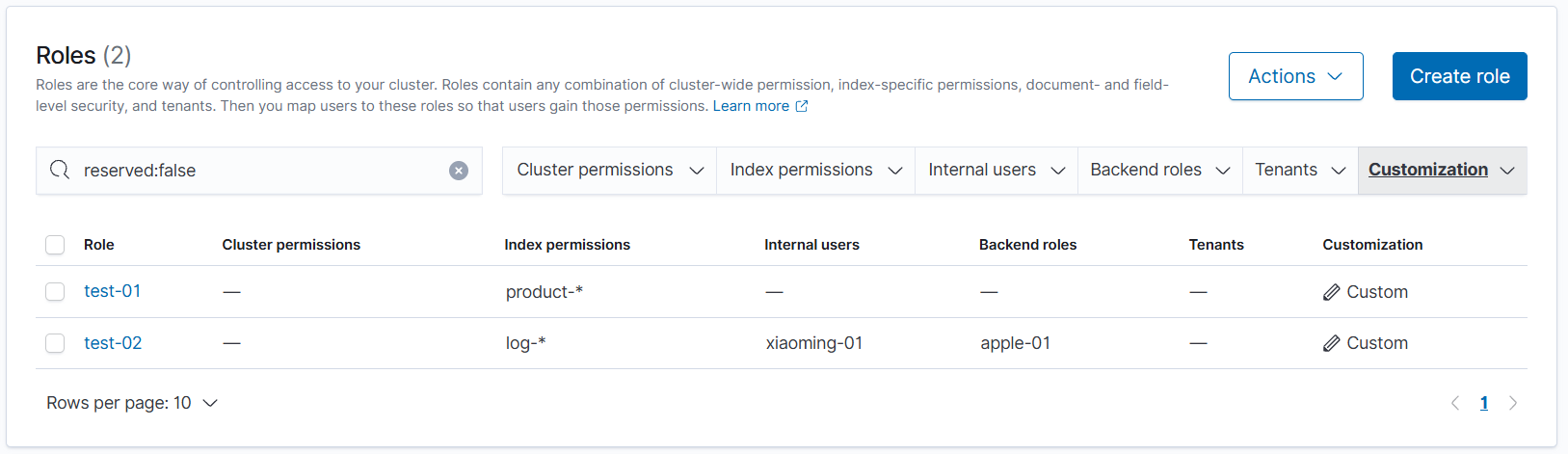 相当于没有 Backend roles,用户 xiaoming-01 直接与 test-02 关联,拥有读取 log- 开头索引的权限。
