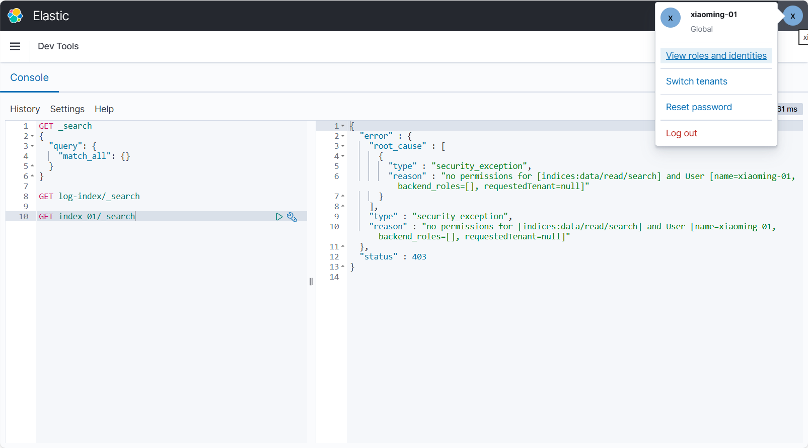 但没有权限读非 log- 开头的索引,会报错:no permissions for [indices:data/read/search] and User [name=xiaoming-01, backend_roles=[apple-01], requestedTenant=null]。