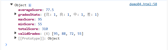 结果返回:返回一个对象,包含有效成绩数组、总分、平均分、最高分、最低分以及等级统计对象。