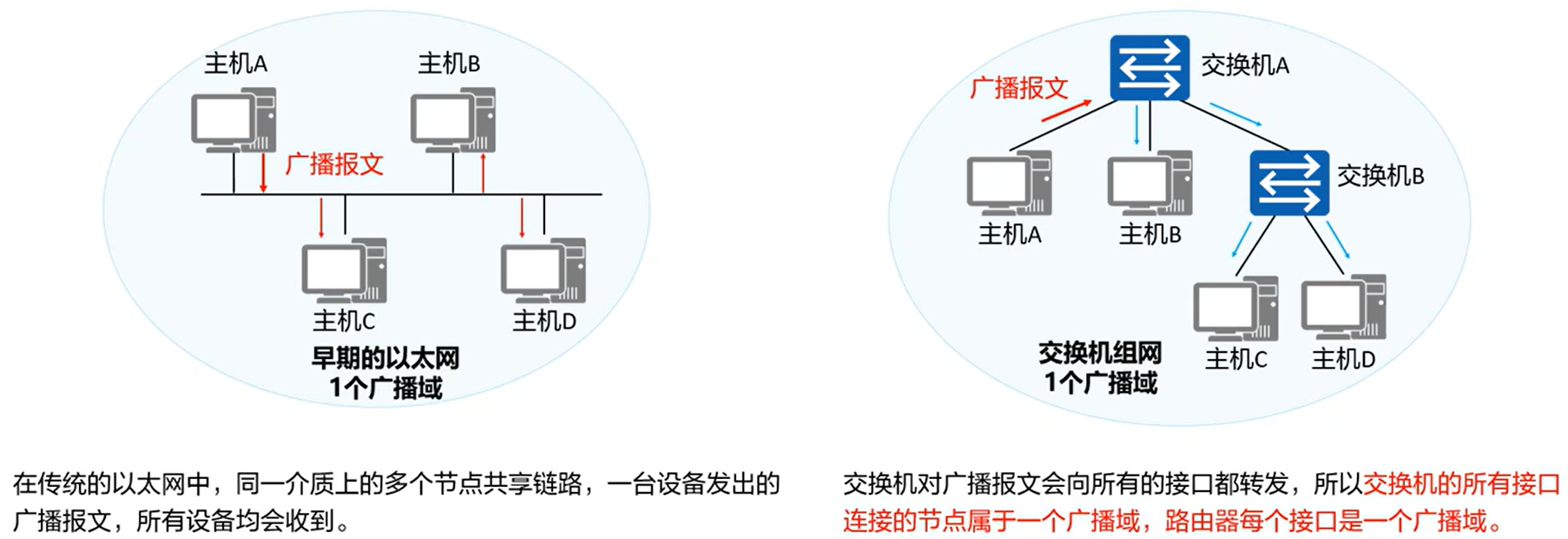 - 广播报文所能到达的整个访问范围称为二层广播域,简称广播域,同一广播域内的主机都能收到广播报文。