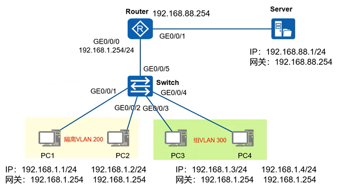 配置:VLAN 100为主网关,VLAN 200为隔离VLAN,VLAN 300为组VLAN。