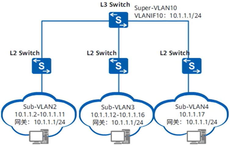- VLAN 10为Super-VLAN, VLAN2 ~ VLAN4/E为Super-VLAN 10的Sub-VLAN。Sub-VLAN2、Sub-VLAN3和Sub-VLAN4共用一个子网10.1.1.0/24,这样,该网络中就只有一个子网号10.1.1.0,一个子网缺省网关地址10.1.1.1和一个子网定向广播地址10.1.1.255,共3个IP地址不能被主机使用,其余都可以被主机使用。而且,各Sub-VLAN间的界线也不再是从前的子网界线了,它们可以根据其各自主机的需求数目在Super-VLAN对应子网内灵活的划分地址范围,比如Sub-VLAN2实际需要10个,就给它分配10.1.1.2~10.1.1.11的地址段。