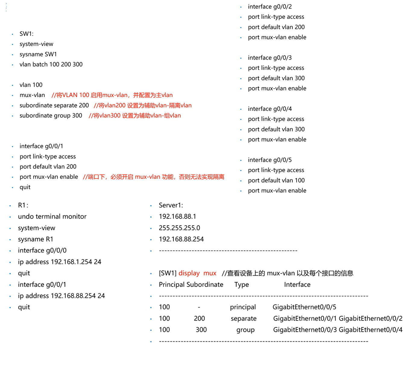 - MUX-VLAN技术将VLAN分为:主VLAN和辅助VLAN(组VLAN、隔离VLAN)