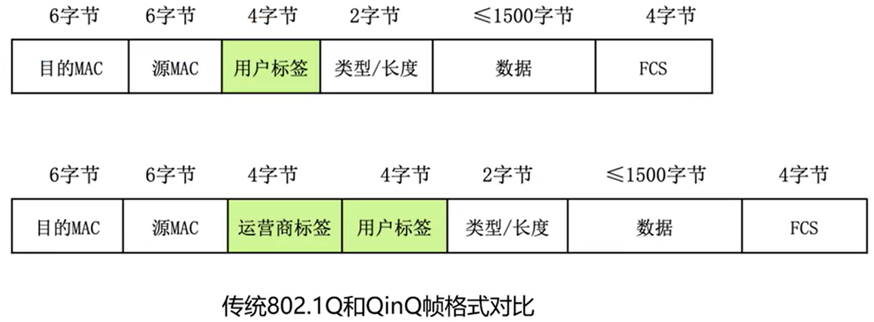 - QinQ:双层标签,一般用于运营商城域网。