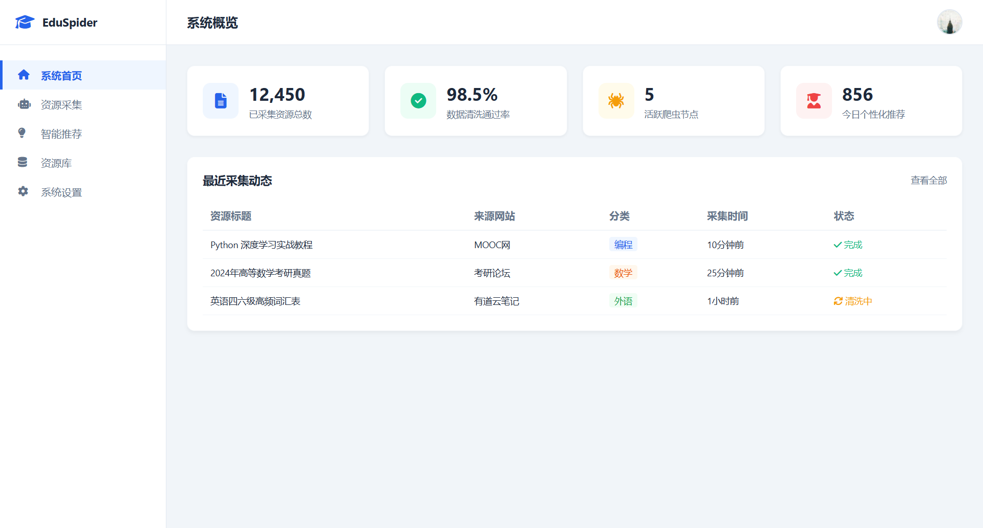 - 关键字:教育资源, 爬虫采集, 个性化推荐, 学习资源