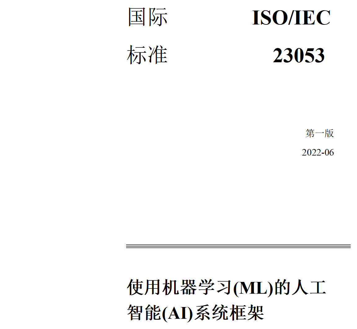 ISO/IEC 23053:2022是一部关于使用机器学习的人工智能系统的框架性国际标准,其第一版于2022年6月发布。该标准旨在为描述此类系统提供一个通用的、包含系统组件、功能与术语的框架,涵盖机器学习任务、模型、数据、工具、学习方法及开发部署流程(机器学习管道),适用于各类组织,并为制定面向机器学习系统具体方面的其他标准奠定了基础。