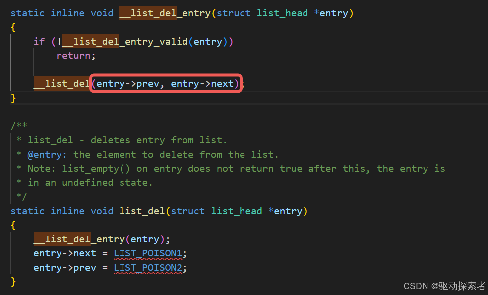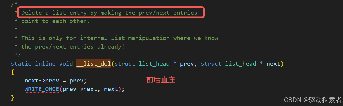 底层实现由 __list_del() 完成。