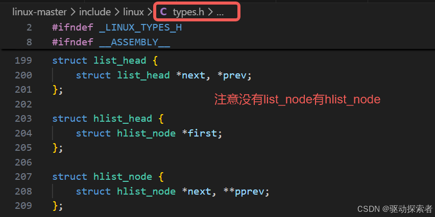 Linux 中"链表头"本身也是一个 struct list_head,并不区分"头节点"与"普通节点"。