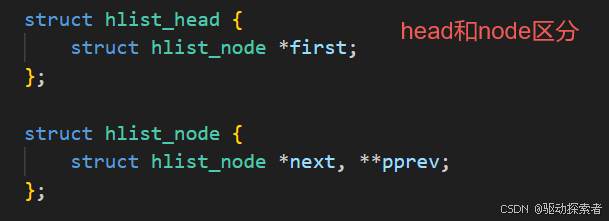 其中 pprev 是指向"前驱 next 指针"的指针,这是 hlist 的关键设计。