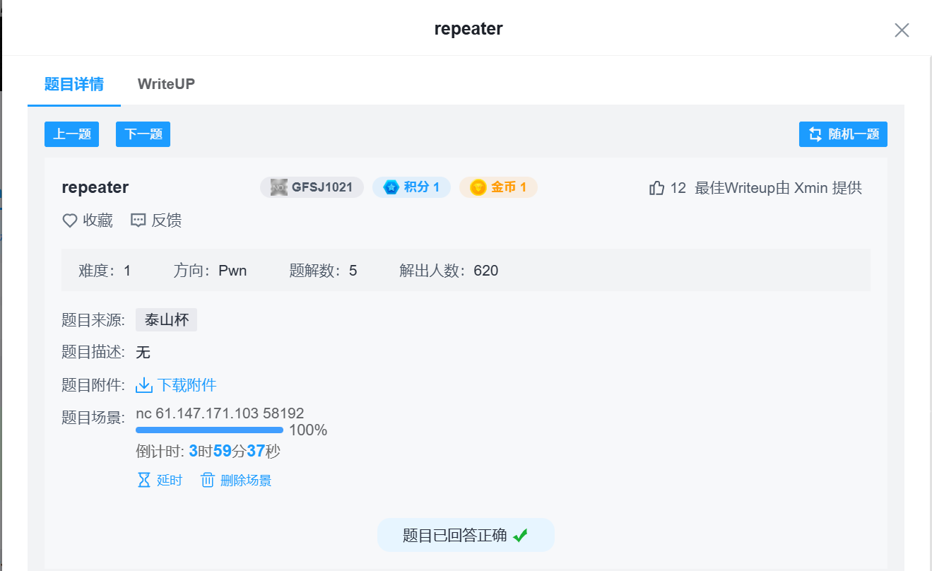 题目给了一个附件和一个远程攻击的服务器IP地址和端口号,附件中只有一个二进制文件repeater