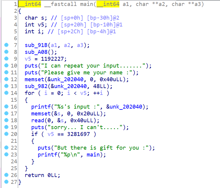 再往下,在没有人为干预情况下v5=1192227,因此进入循环,循环中重点是用read函数读取0x40(64)个字节的数据到s中,而s到bp只有48个字节,这是一个很明显的栈溢出。另外还需要注意到,当v5=3281697时程序会把main函数的地址泄露出来,这一点或许会有助于计算我们想要的函数或变量地址