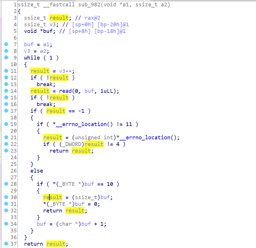 下面用puts输出两句提示信息后利用sub_982函数读入最多48个字节数据到unk_202040变量中,sub_982函数内容如下图所示,只要能看出来是用于读取用户输入的就可以