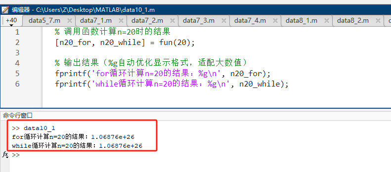fprintf('while循环计算n=20的结果:%g\n', n20_while);