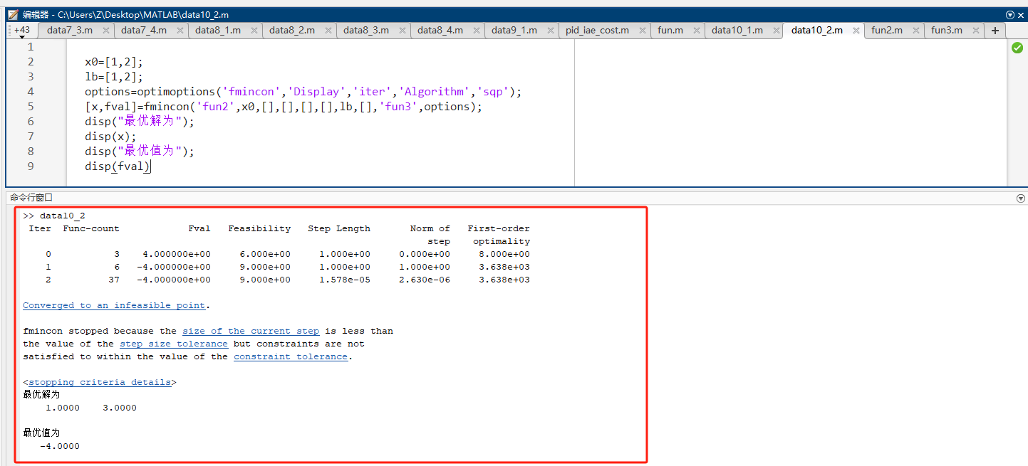 [x,fval]=fmincon('fun2',x0,[],[],[],[],lb,[],'fun3',options);