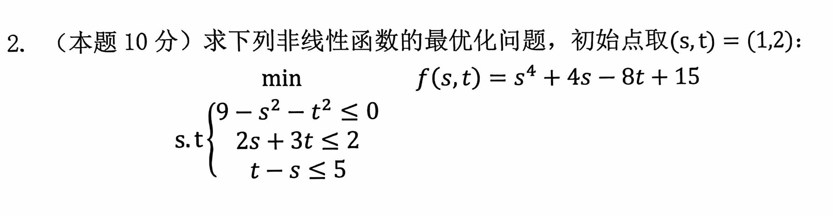 {2s+3t≤2t−s≤5 \begin{cases} 2s + 3t \leq 2 \\ t - s \leq 5 \end{cases} {2s+3t≤2t−s≤5 - 非线性不等式约束: