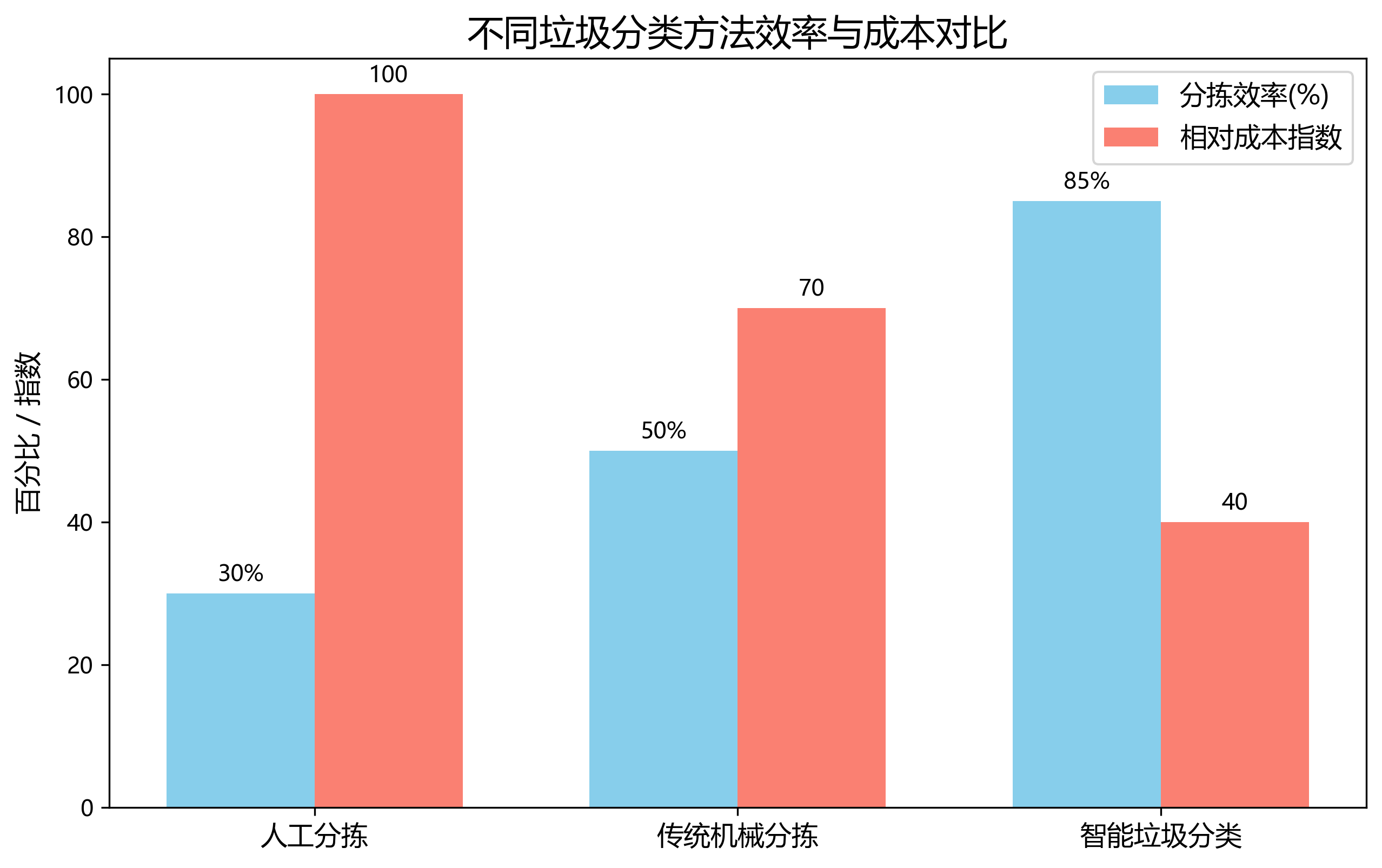 - 降低人工成本:减少人工分拣需求,每个垃圾回收站可节省3-5名分拣工人
