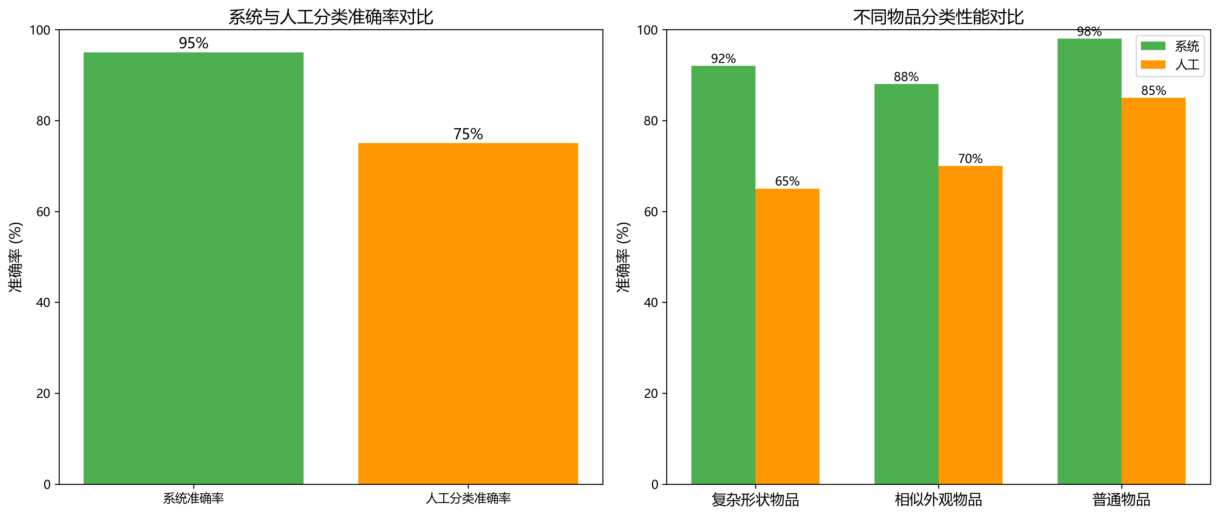 在实际应用中,系统的准确率达到了95%以上,大大提高了垃圾分类的效率和准确性。特别是在处理形状复杂或外观相似的物品时,系统的表现明显优于人工分类。