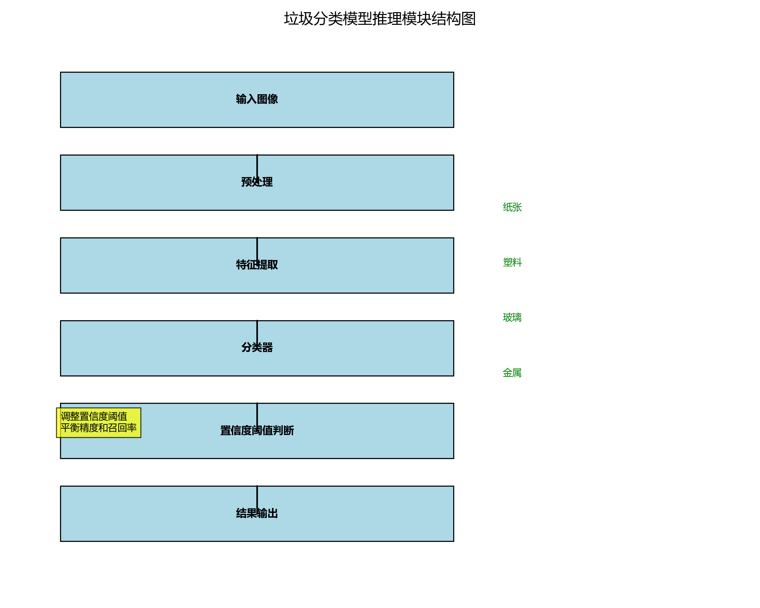 模型推理模块的关键在于优化推理速度和准确性之间的平衡。对于垃圾分类应用,我们主要关注的是常见可回收物类别,如纸张、塑料、玻璃、金属等。在实际部署时,可以根据具体需求调整模型的置信度阈值,以平衡检测精度和召回率。