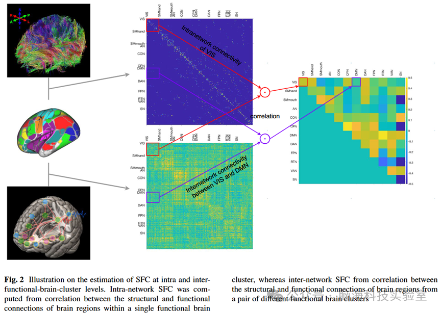 网络内SFC:针对每一个功能网络(如默认模式网络),提取该网络内部所有脑区对的结构连接值和功能连接值,然后计算这两组值之间的相关性。这反映了单个功能网络内部其结构与功能连接的匹配程度。