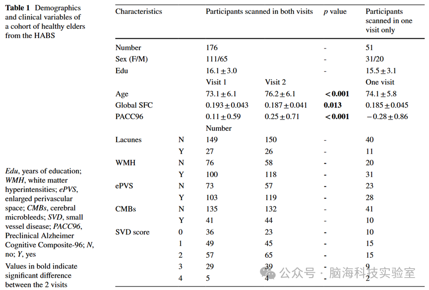 排除标准包括:有酗酒、药物滥用、头部外伤史,或当前患有严重的躯体/精神疾病。研究中明确排除了被诊断为轻度认知障碍或痴呆的个体。从人口学特征来看,纳入核心分析的176名被试中,女性111人,男性65人,平均受教育年限为16.1 ± 3.0年,首次访视时的平均年龄为73.1 ± 6.1岁。此外,该群体在基线时已表现出小血管病的影像特征,例如27人存在腔隙,100人存在白质高信号,103人有基底节区扩大的血管周围间隙,41人存在脑微出血,显示出这是一个典型的、认知正常但已出现血管衰老迹象的社区老年人样本。