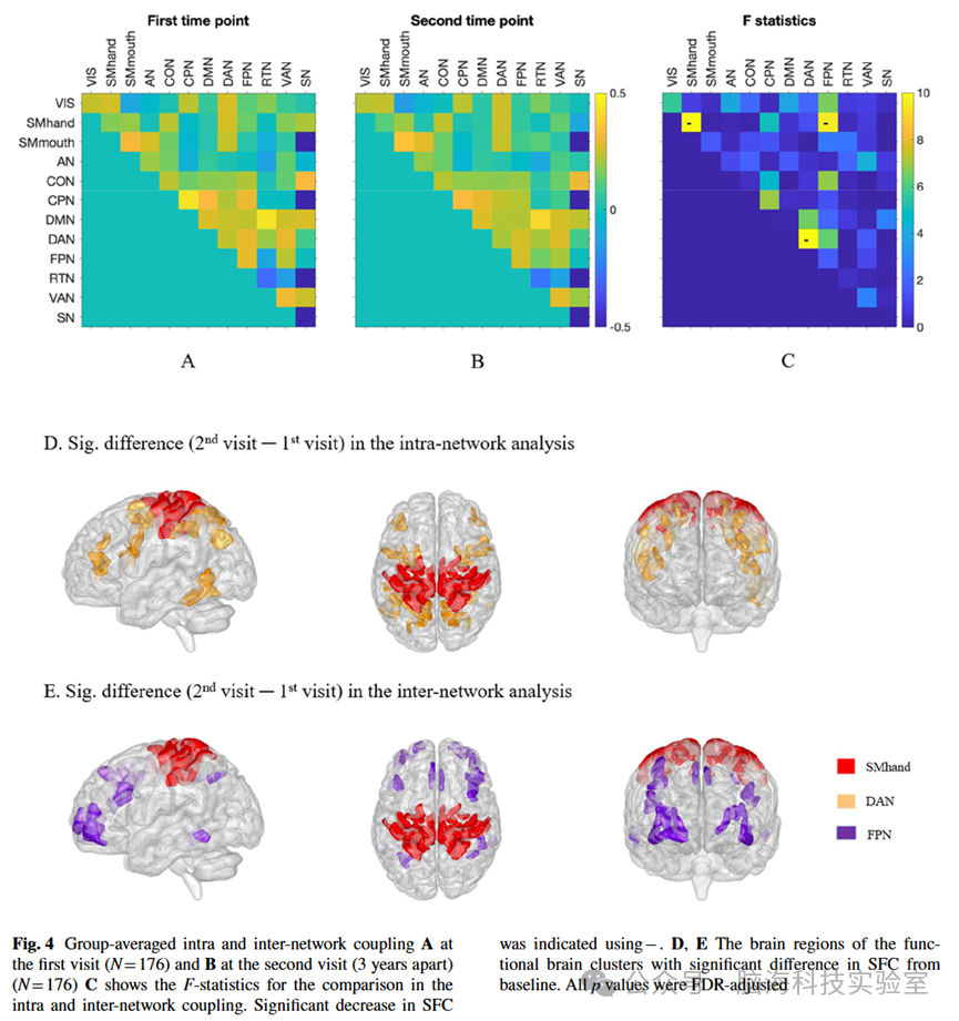 图4首次访问时的组内和网络间耦合 A(N=176)和第二次访问时的 B(相隔 3 年)(N=176)的组平均耦合,C显示了网络内和网络间耦合比较的 F 统计量。