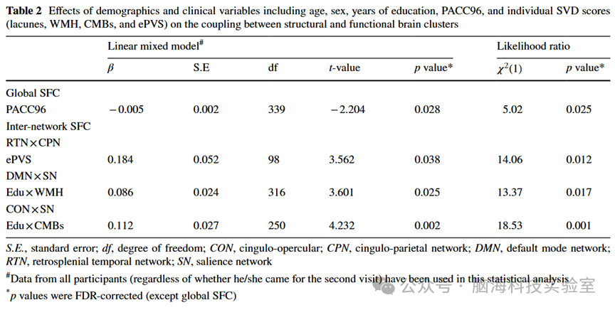 表2人口统计学和临床变量(包括年龄、性别、教育年限、PACC96 及个体 SVD 评分(缺孔、WMH、CMB 和 ePVS)对结构性与功能性脑群群耦合的影响