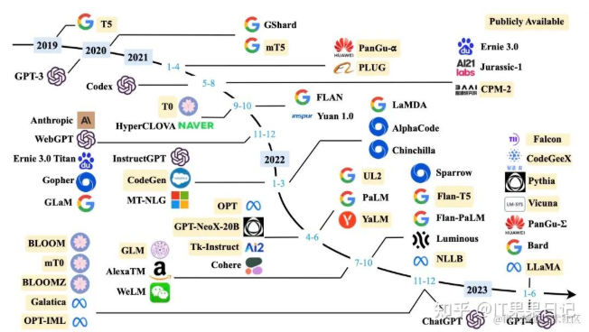 除了OpenAI外,国内外还有非常多的公司参与大模型赛道,下面图2是截止到2023年6月底国内外重要的大模型的发展脉络。