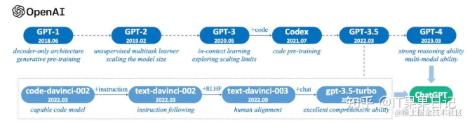 GPT系列大体经历了如下6个发展阶段(下图上一行),最新的版本是GPT-4,目前一直在迭代优化中。下图第二行是基于GPT-3.5的一系列迭代版本(大家如果购买过openAI的大模型账号并进行过相关开发,应该是知道这些名字的),这个版本被大家熟知是2022年11月30日发布的chatGPT,目前chatGPT一直在优化中,GPT-4中的能力也逐步融入到了chatGPT中,chatGPT是一个不断进化的系统。