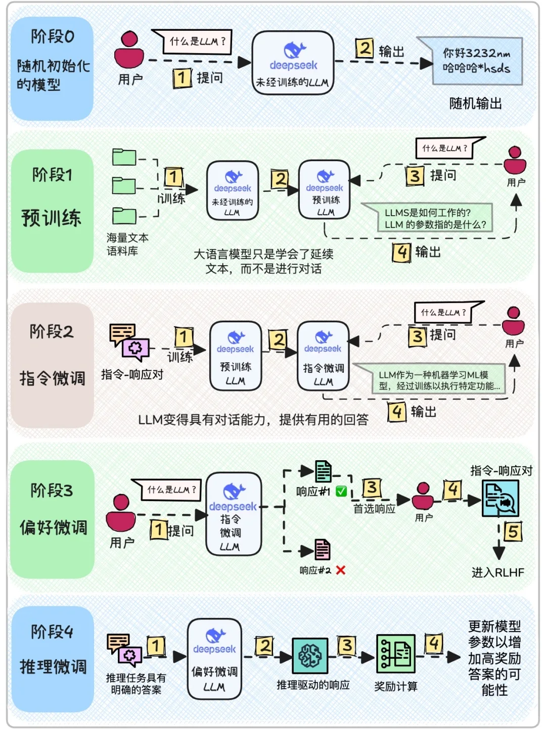 大型语言模型的训练是一个持续迭代的过程,每个阶段都需要仔细规划和执行。随着技术的进步,模型的训练方法也会不断发展和完善。