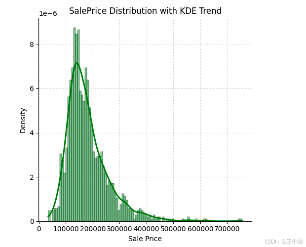 房屋价格SalePrice通常呈右偏分布(少数高价房拉高均值),直接预测会导致模型对高值样本误差大。