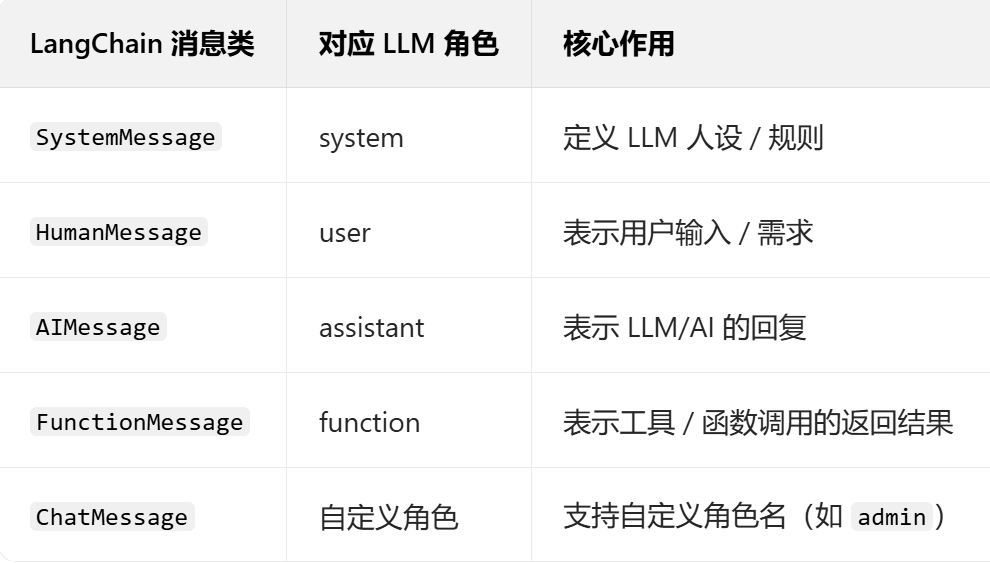 这些模型提供商不同,但对于其输入和输出,统一使用 LangChain 的消息格式。LangChain 消息格式主要分为五种,分别是: