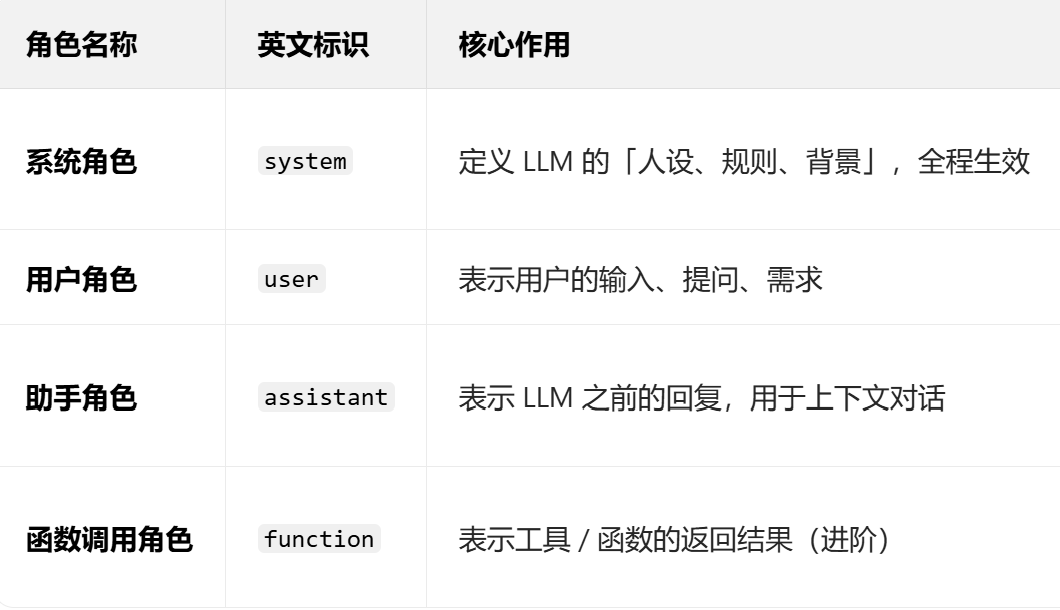 **消息角色 (Role):**用来 区分对话中不同类型的消息,并帮助聊天模型了解如何响应给定的消息序列。