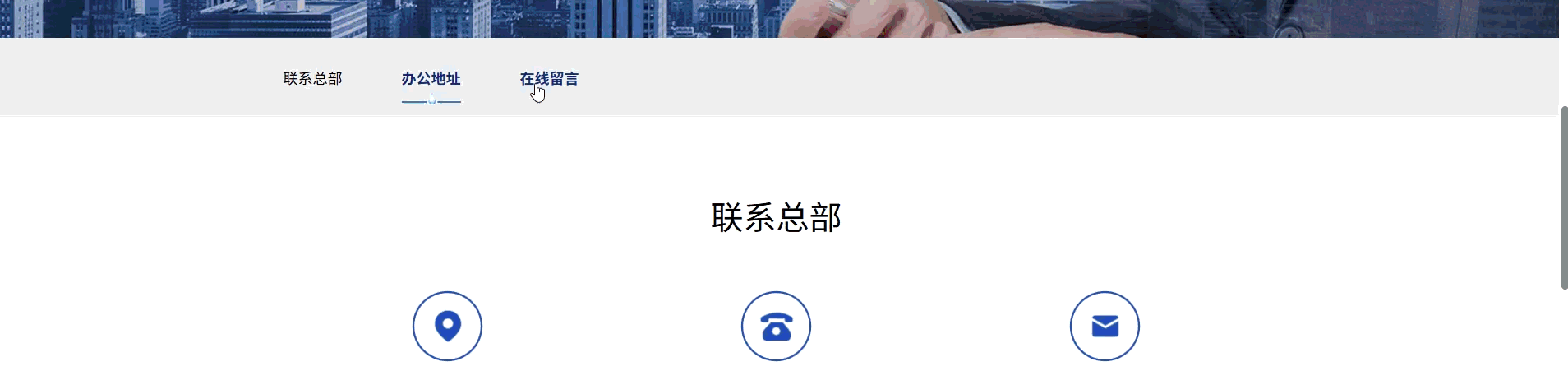 用户点击任一 Tab,页面应平滑滚动 至下方对应的 .headquarters、.address 或 .message 区块。