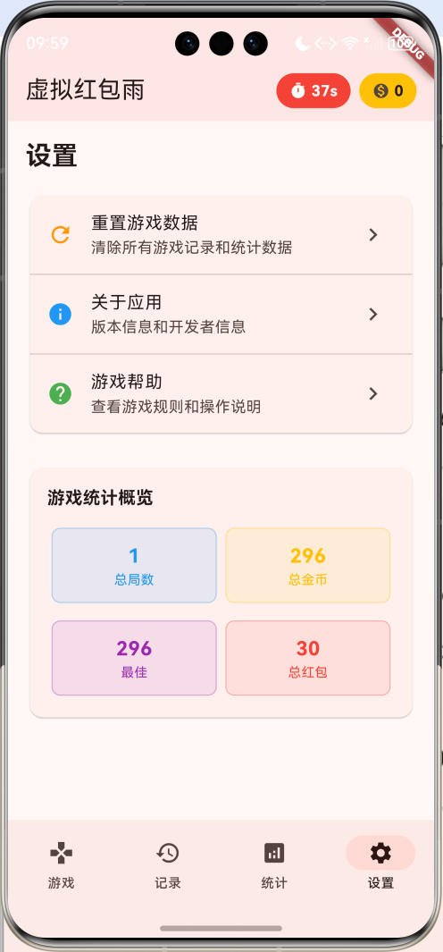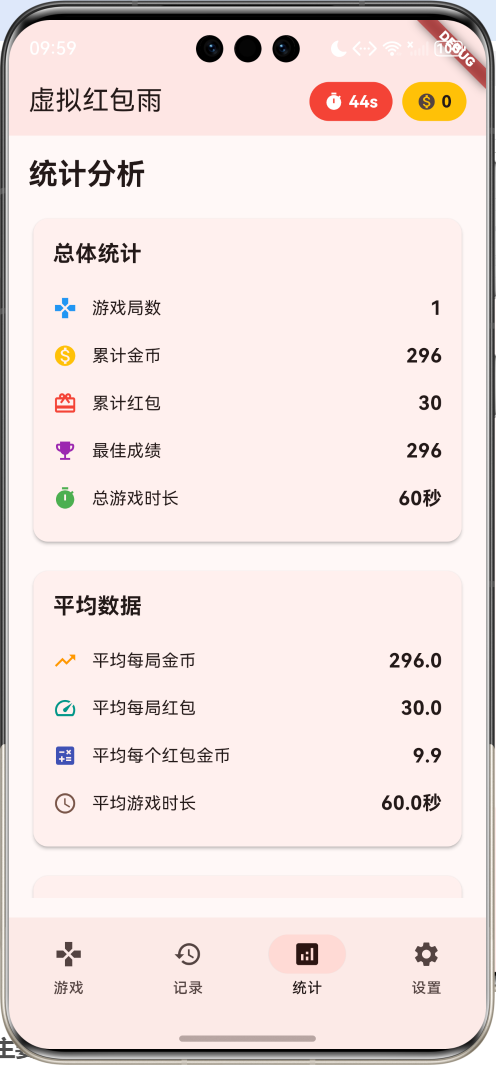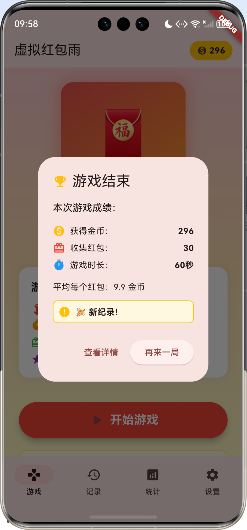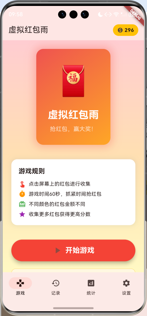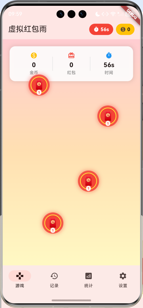 虚拟红包雨应用通过Flutter框架实现了一个完整的休闲游戏,包含了游戏逻辑、动画效果、数据统计、用户界面等多个方面的功能。