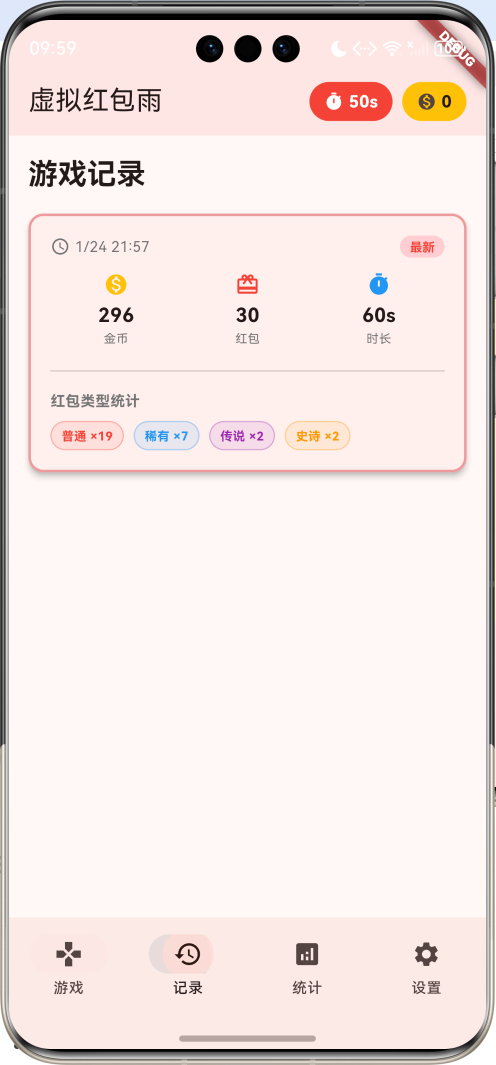 虚拟红包雨是一款有趣的休闲游戏应用,玩家需要在限定时间内点击屏幕收集从天而降的红包来获得金币。应用包含四种不同稀有度的红包、精美的动画效果、详细的游戏记录和统计分析功能。