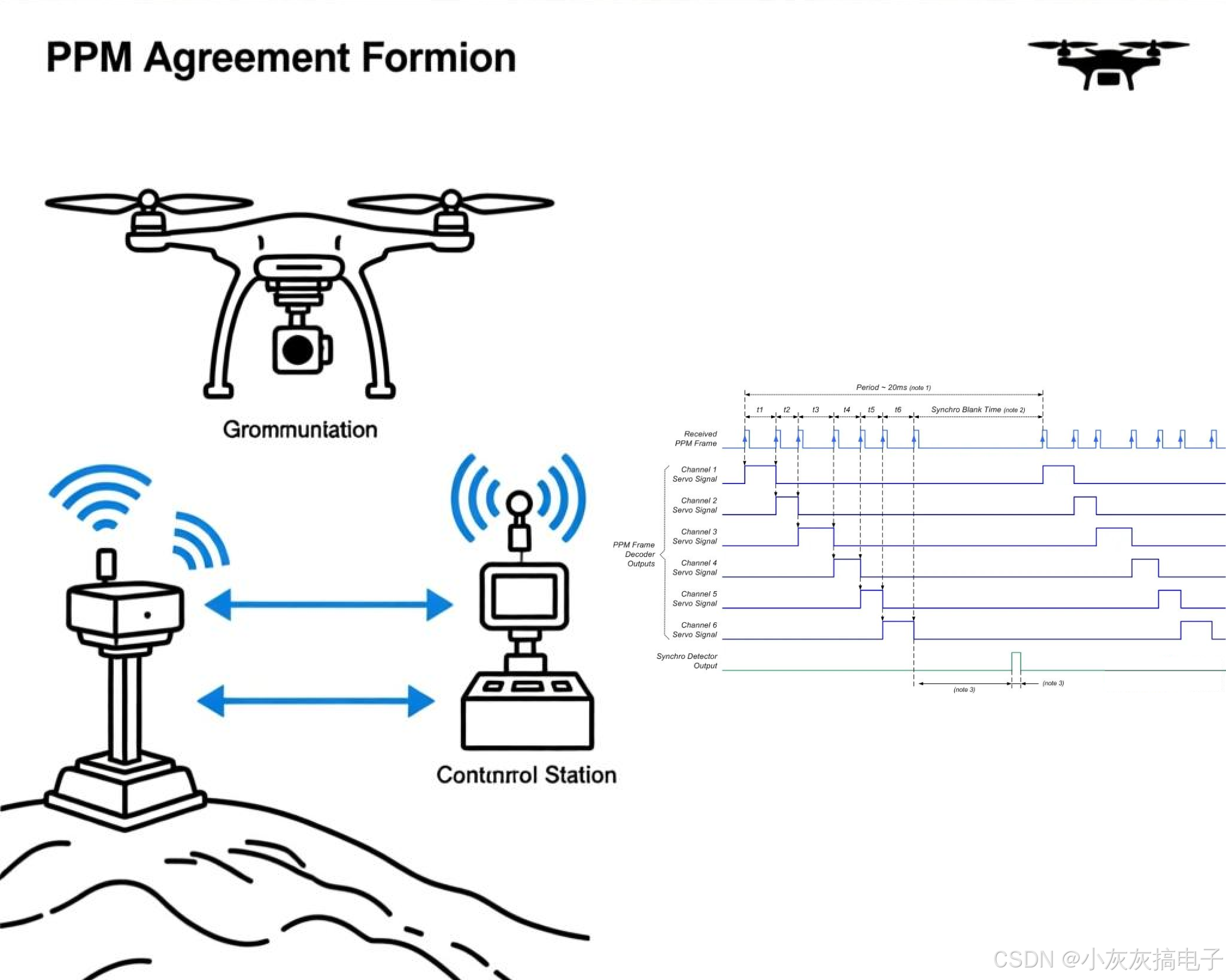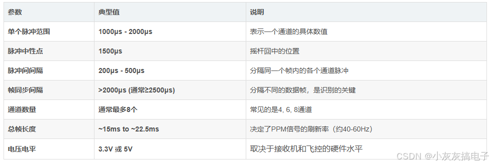 PPM(Pulse Position Modulation,脉冲位置调制)是无人机遥控系统中常用的信号传输协议,主要用于遥控器与接收机之间的通信。其核心原理是通过脉冲在时间轴上的相对位置来表示不同通道的控制信号。
