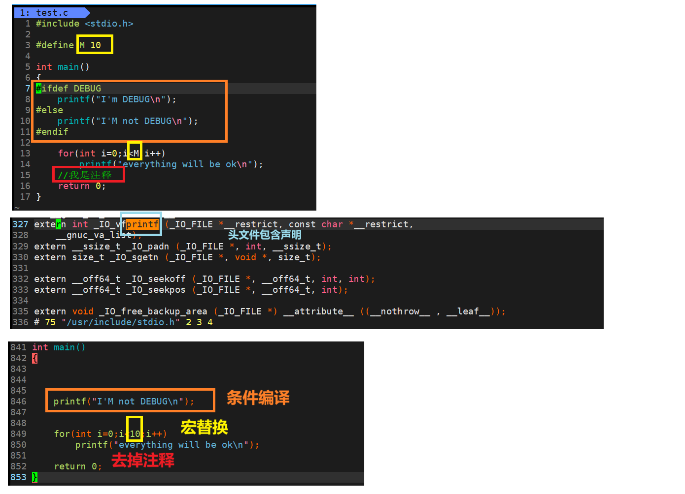 gcc -E test.c -o test.i -DDEBUG 因为预处理是可以对.c文件做修改的,所以在指令中加入宏定义也可以